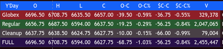 The ES traded 6644.50 as the 3:50 cash imbalance showed $2.9 billion to sell, which increased to almost $4 billion to sell, and traded 6637.50 on the 4:00 cash close. The ES traded down to 6624.75 and settled at 6639.75, down 52.25 points, or -0.78%, down 4 sessions in a row, totalling -236 points, a loss of -3.47%.