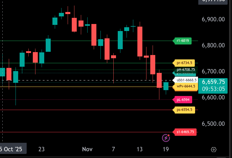 First upside resistance is 6708.75, with a further push targeting 6734.50 as the upper range target. A sustained move above 6734.50 opens the door toward 6819.