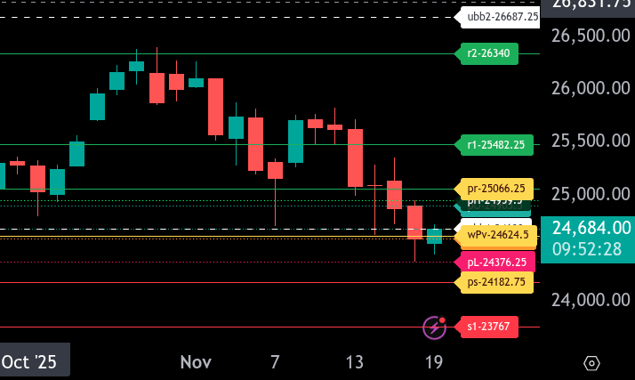 Overall, holding above 24,624.50 keeps buyers in control for now, but dipping back under it quickly flips the bias back to sellers.