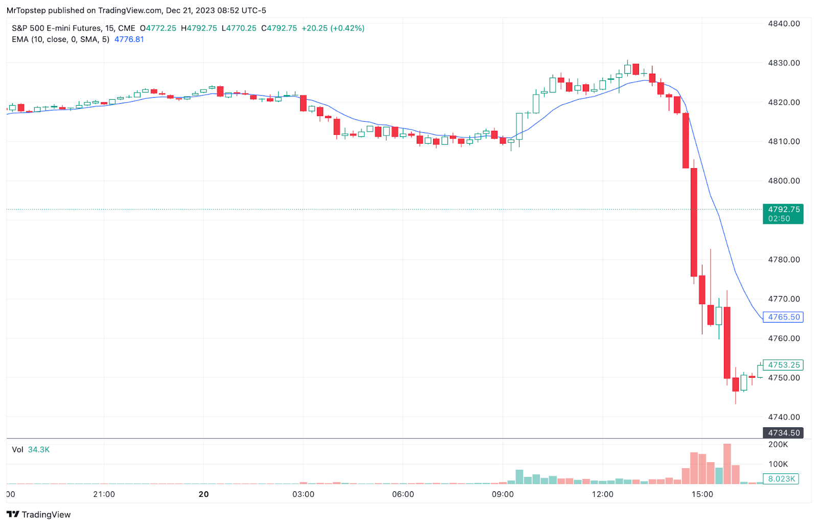 The ES rallied back up to 4790.00 and then dropped down to 4761.00 at 3:09. After the low, the ES rallied back up to 4777.75, sold off down to 4767.25 at 3:15 and then rallied back up to 4782.75, before dropping down to a new low at 4759.75 at 3:37 as the early imbalance showed $866 million to sell and traded back up to 4768.75 at 3:46. The ES traded 4767.50 as the cash imbalance showed $1.4 billion to buy, rallied up to 4772.25 and then sold off back to the low of the day at 4748.00 at 3:59 and traded 4750.50 on the 4:00 cash close. After 4:00, the ES sold off down to 4743.25, rallied back up to 4749.50, and traded 4753.25 on the 5:00 cash close, down 65 points or -1.53% on the day and down 87.5 points off the high of the day.